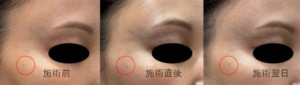 一時的に濃くなる期間はありますが、シミ取りレーザー治療時の様にテープ保護期間や美白剤塗布が必要になることはほとんどありません。