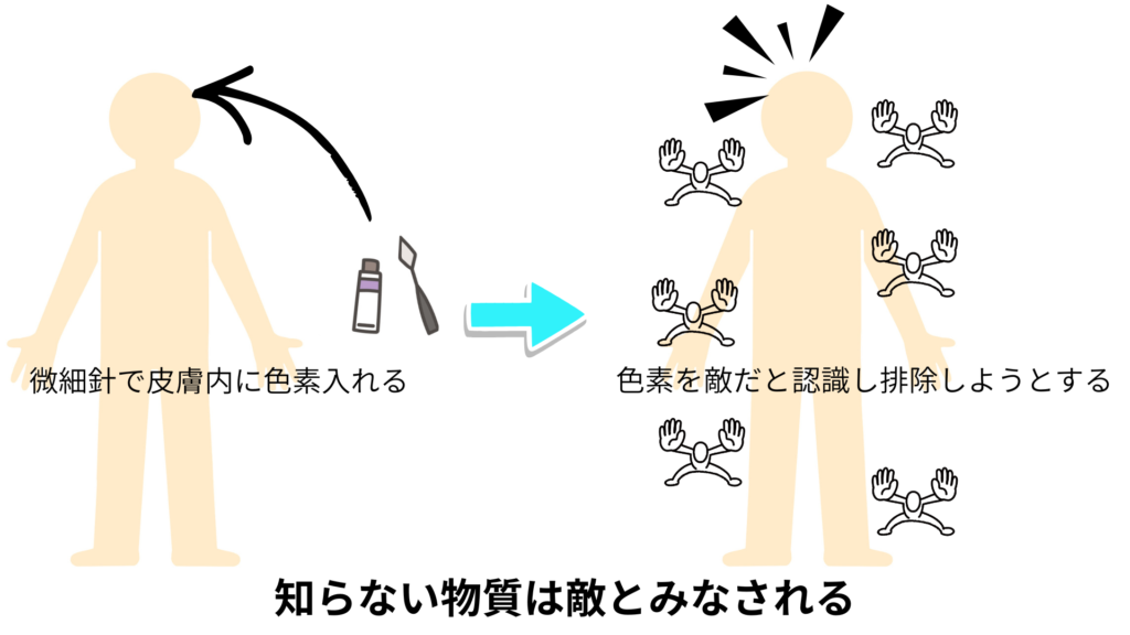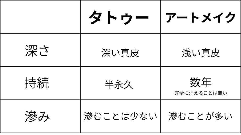 タトゥーとの大きな違いは、色素を入れる深さと持続期間です。