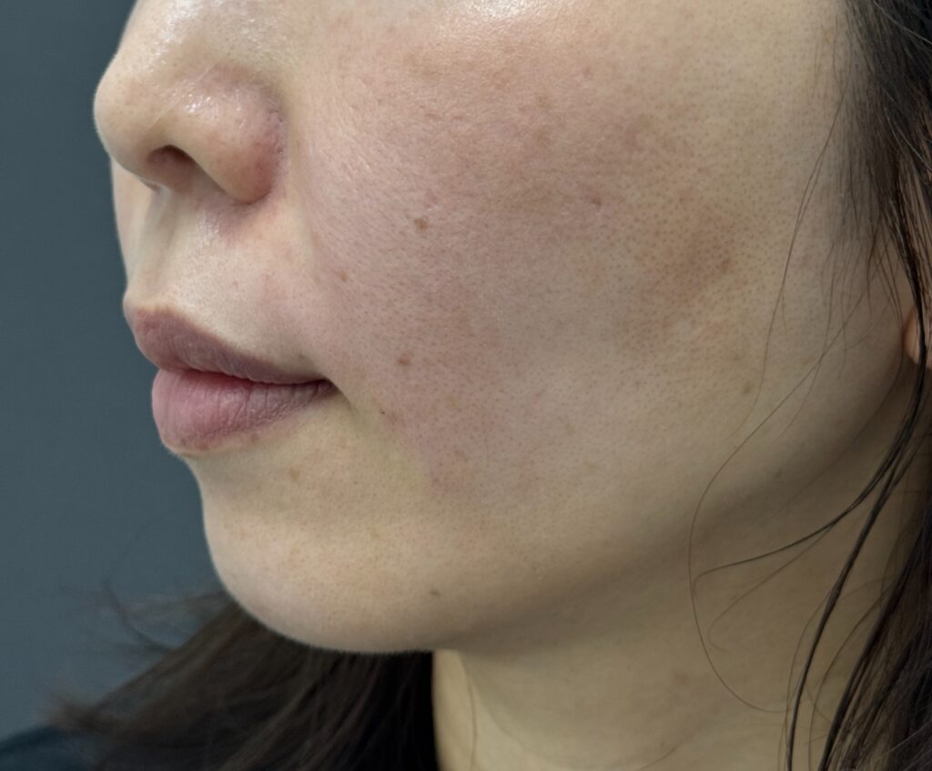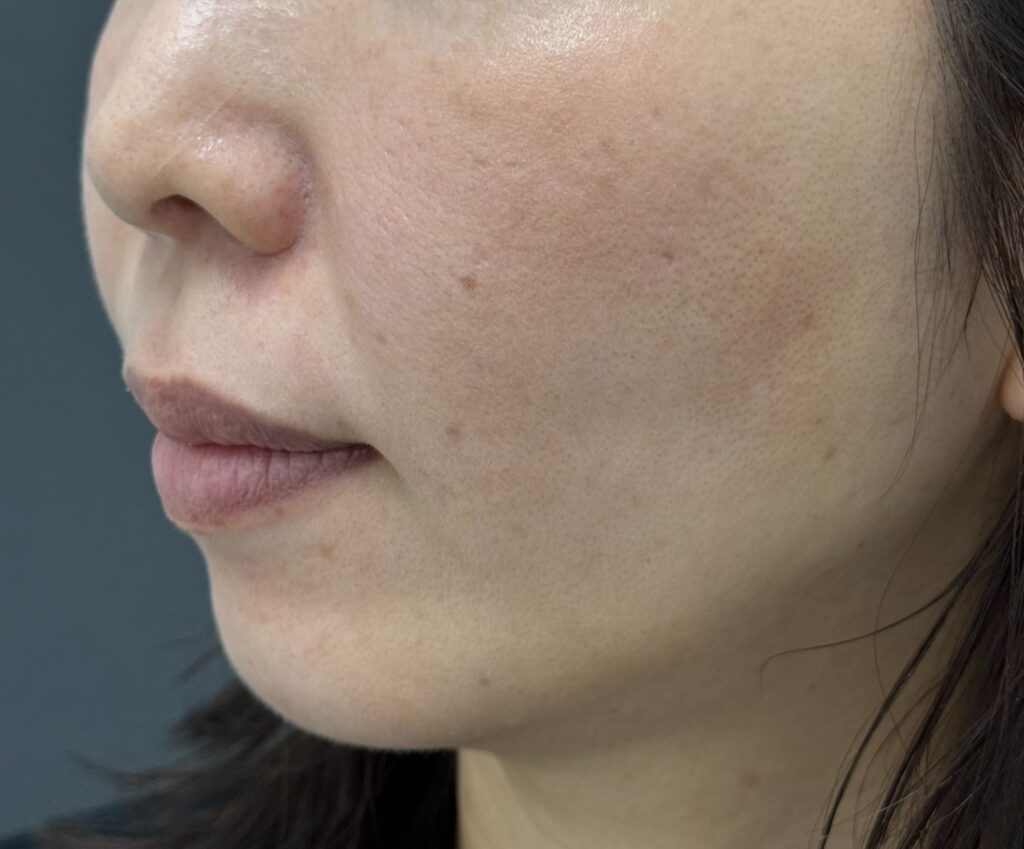 骨格と頬部脂肪による影感が出ているが、皮膚にほうれい線自体はほぼ刻まれていない方の症例です。