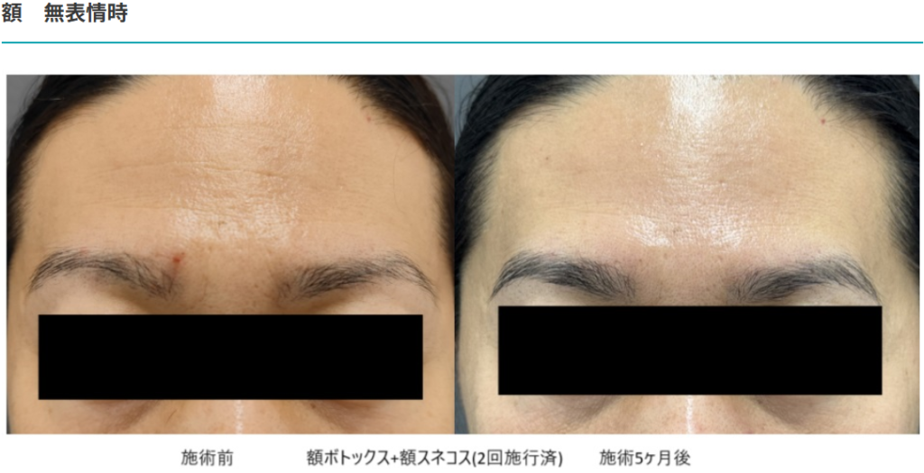 理由: 最大の原因が筋肉の動きにあるため、ボトックスで前頭筋の過剰な動きを抑えることで、額にしわが寄りにくくなります
