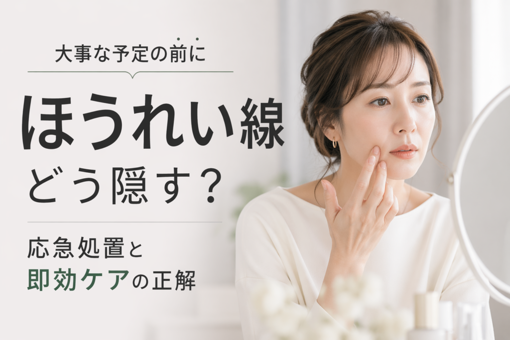 ほうれい線を消そうとして厚く塗ると、かえってほうれい線にファンデーションがたまり、逆に目立つことがあります。イベント前ほど、しっかり隠すより、光の反射や質感で自然に目立ちにくくする方が現実的です。