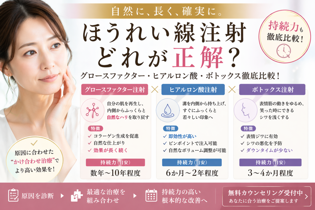 無理に治療をおすすめすることはありません。まずは原因を見極めたうえで、グロースファクター、ヒアルロン酸、ボトックスのどれが合うのか、一緒に整理していきます。