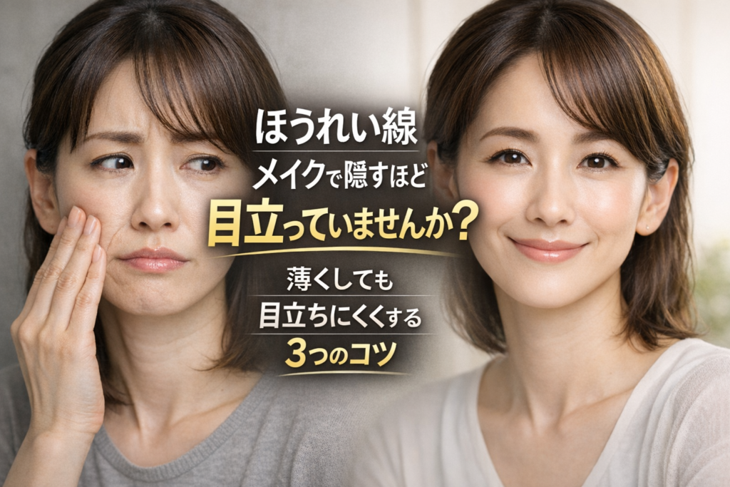 ほうれい線をメイクで完全に消そうとすると、かえって溝や影が強調されて老けて見えることがあります。大切なのは、厚塗りで隠すことではなく、乾燥を防ぎ、影をやわらげ、顔全体の重心を上げて見せることです。浅い段階ならメイクでかなり印象を整えやすい一方で、夕方に必ずヨレる、線にファンデがたまる、ノーメイクとの差が大きいという場合は、メイクだけでは限界が出ていることもあります。