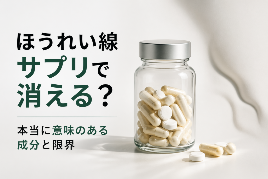 なお、サプリメントだけでなく外側からのケアも気になる方は、ほうれい線×化粧品の選び方のコツも参考になると思います。